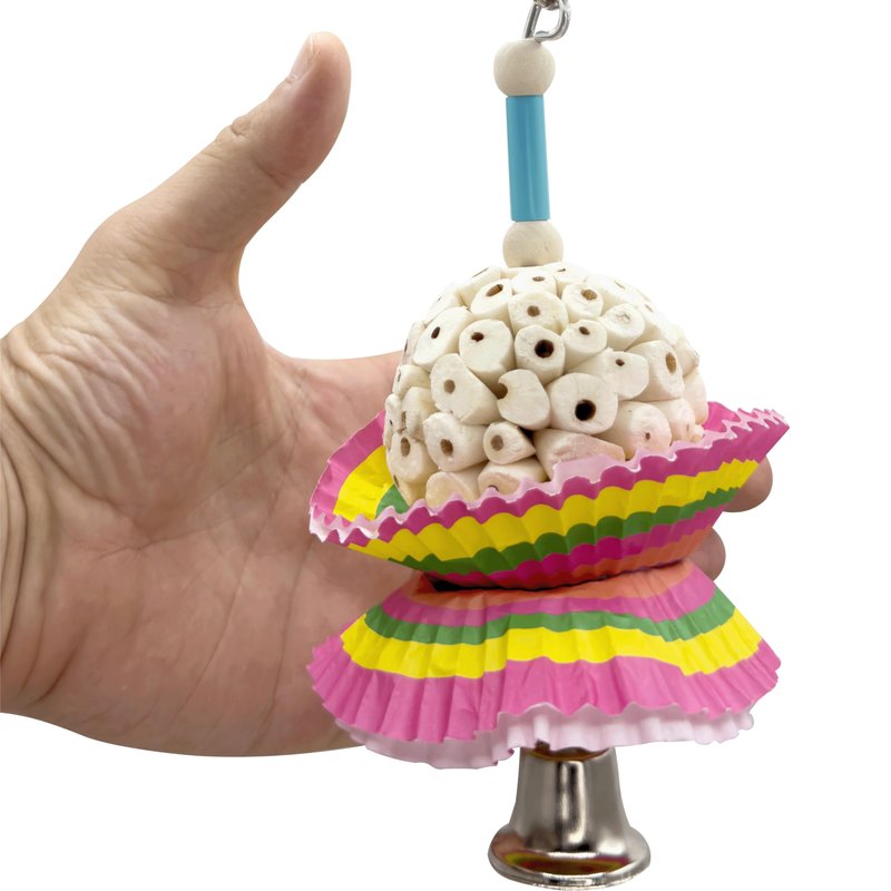 - FUN TO CHEW - The body of the bird toy is made from a handmade sola wood ball that sits inside of food grade cup cake cups. Sola wood is a super lighweight wood and is enjoyable for birds to chew.