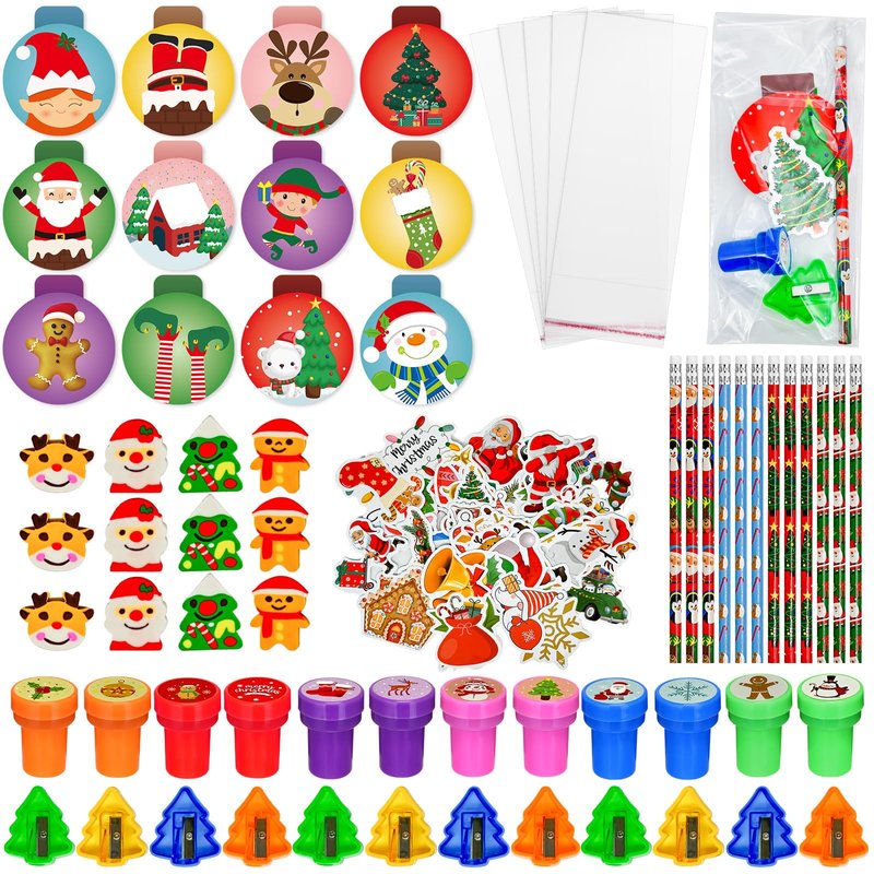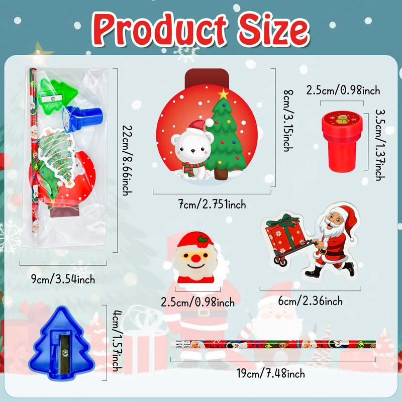 - Various Stationery Sets: our Christmas school stationery set includes 24 round stickers, 24 pencils, 24 erasers, 24 stamps, 24 Xmas tree pencil sharpeners, 24 opp bags,50 snowflake stickers to meet your needs