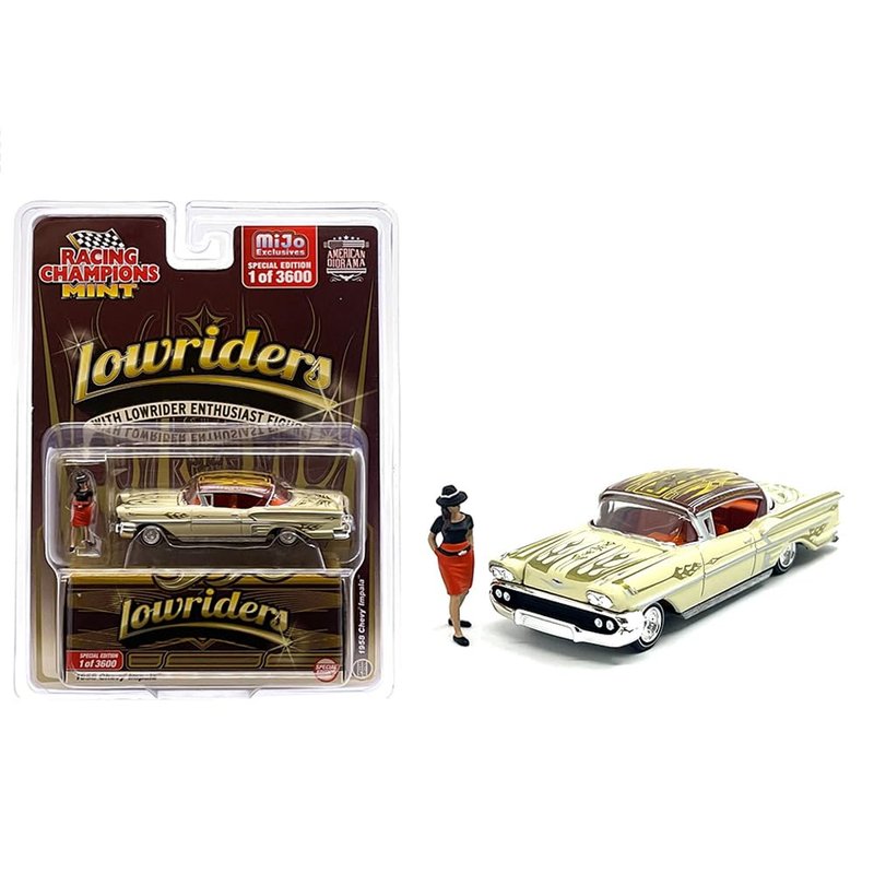 Brand new 1/64 scale diecast car model of 1958 Chevy Impala Lowrider Beige with Graphics and Orange Interior with Diecast Figure Limited Edition to 3600 pieces Worldwide die cast model car by Racing Champions RCCP1012
