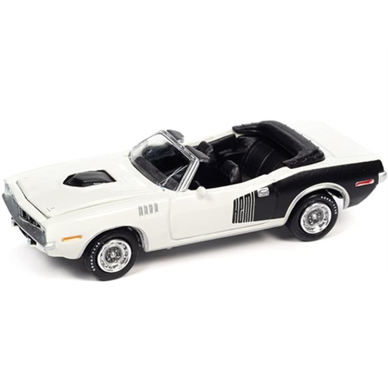 Brand new 1/64 scale diecast car model of 1971 Plymouth Barracuda Convertible Sno White with Black Hemi Side Billboards "Class of 1971" Limited Edition to 7418 pieces Worldwide "Muscle Cars USA" Series die cast model car by Johnny Lightning JLMC026-JLSP153A