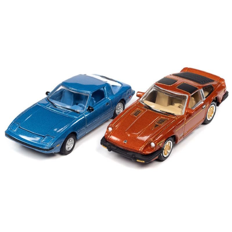 Brand new 1/64 scale diecast car models of 1982 RX-7 Blue Metallic and 1981 Datsun 280ZX Orange Mist Metallic "Import Heat" Set of 2 Cars die cast model cars by Johnny Lightning JLPK014-JLSP169B