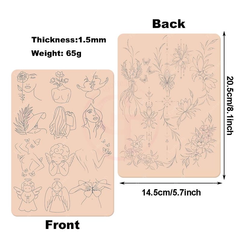 Features: Item Name: Tiny Tattoo Skin Material: Silicone Thickness: 1.5mm Weight: about 65g Features 1: Double Sided Designs Features 2: The practice skin feature over 50 different stencil designs. The white skin with light gray outline, fine line tattoo practice pad for training to improve the tattoo skills. Package: 2pcs X Tiny Tattoo Practice Skin