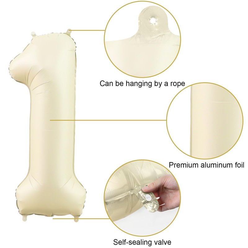 - 🎉Easy to Use - Cream white one year old birthday balloons can be blown up with air or helium! The party balloons are extremely easy to inflate and string up. The number 1 foil balloons have self-sealing valve does not need to be knotted, Balloons filled with air will last a long time, very easy to assemble. Use an air pump to help you fix the shape of the balloon, saving time and having fun! You can use a straw to slowly deflate the white number balloons and fold them neatly for next time use.