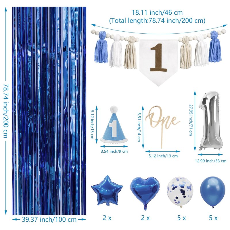 - WHAT'S INCLUDED:A tassel banner with number "1", a birthday hat, a cake topper, two rain curtains, a versatile balloon set (star, heart, latex, and confetti balloons), and a number balloon to mark the milestone.