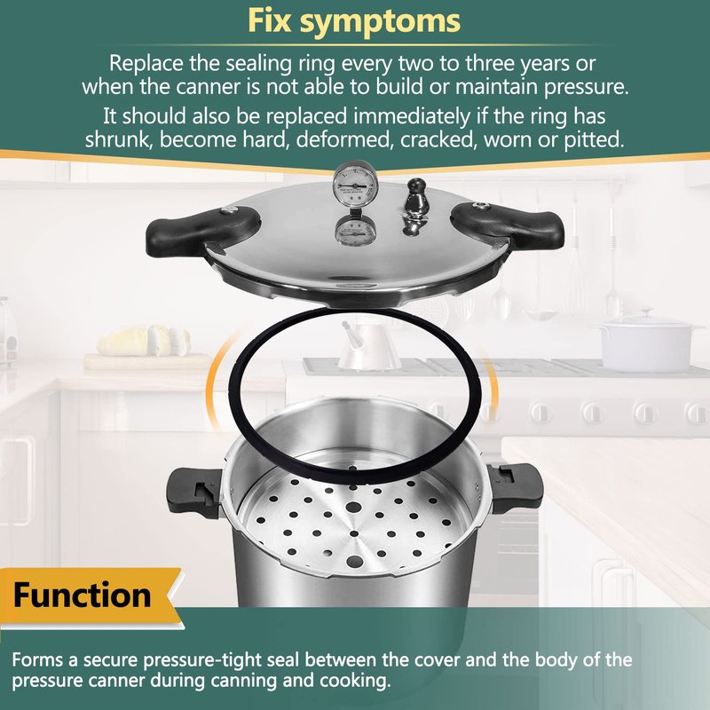 - ✅ Function: The sealing ring fits around the inside rim of the cover and forms a secure pressure-tight seal between the cover and the body of the pressure canner during canning and cooking. Replace the sealing ring every two to three years or when the canner is not able to build or maintain pressure. It should also be replaced immediately if the ring has shrunk, become hard, deformed, cracked, worn or pitted.