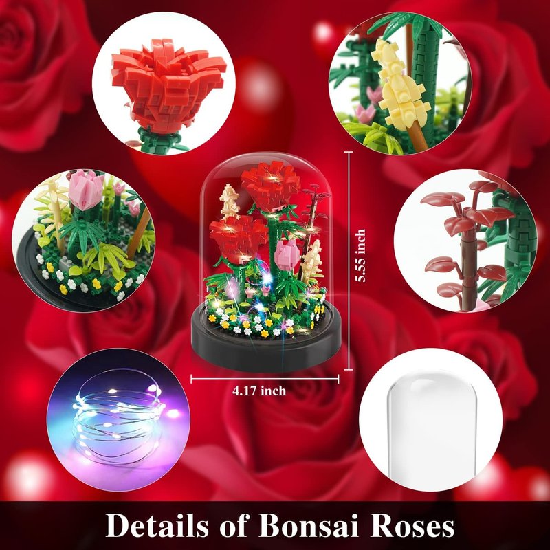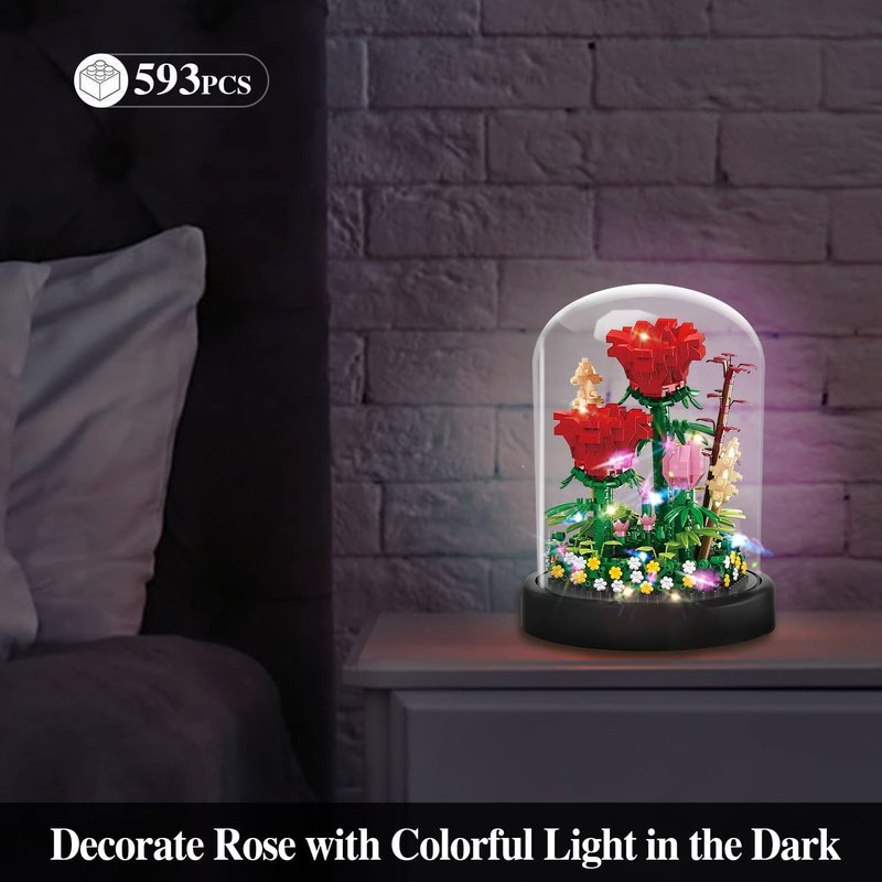 - 🌹【Romantic Rose】Romantic red roses flower bouquet represent sincere and eternal love, which are designed based on the combination of real roses and love. Decorate artificial rose building bricks with colorful LED light band and mounted on a 360°transparent display case, making it an attractive decoration.