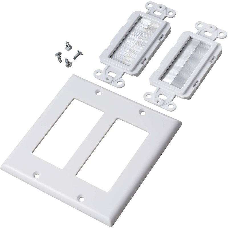 Run all of your Cables cleanly and neatly Perfect for HDTV and Home Theater needs - Deco 2 piece Design. ( Both pieces are included ) - The face plate is made to fit into a standard wall mount and made of durable ABS plastic and white in color - Fits standard double electrical boxes or use rough in mounts found at the hardware stores. - No connectors to figure out just push the cable through the brushes - Screws and instruction sheet is included - Color of wall plate is White - We only have White Just feed the cables through the brushes