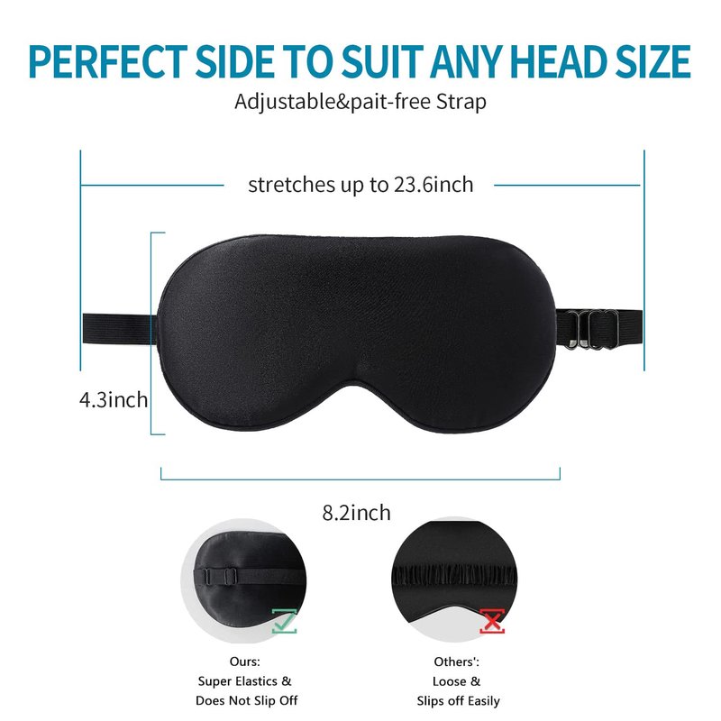 100% Natural Silk Sleeping Mask Our silk eye mask naturally relieves your tension and improves your mood with a restful night's sleep. Naturally breathable, our 100% silk sleep mask calms facial skin for a quicker and sweeter sleep while keeping your eyes relaxed. Superior light protection Made from high-density 19 Momme silk, double-padded for the sound sleep you deserve Adjustable super soft elastic strap The SHJINJU2 eye mask features a comfortable, adjustable and painless headband that won't move or fall off while you sleep. This sleeping mask is very lightweight yet fits perfectly on your face, you can wear it to sleep, focus or meditate on yoga.