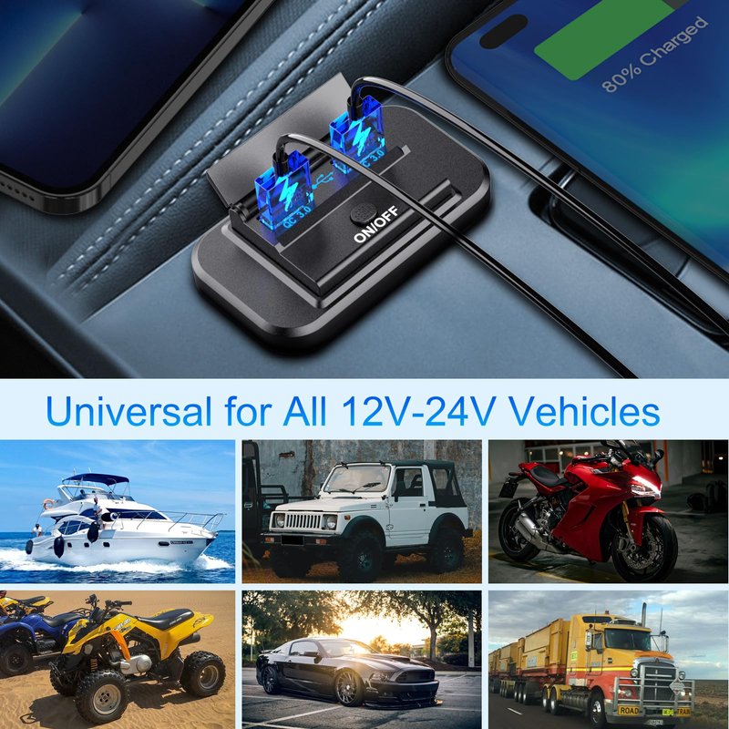 Wide Compatibility: Charge all your Android and iOS devices at maximum charging speed. Moreover, it can be applied to cars, motorcycles, buses, RV, boats and so on.