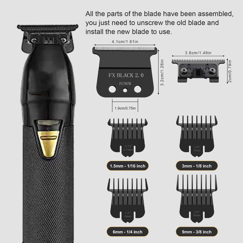 2 Pack 707B Replacement Blade compatible with BaBylissPRO FX787 & FX726 Trimmers,2 Pack DLC Replacement Blades with 4 Guards Set Compatible with BaByliss Trimmer Blades,Black
