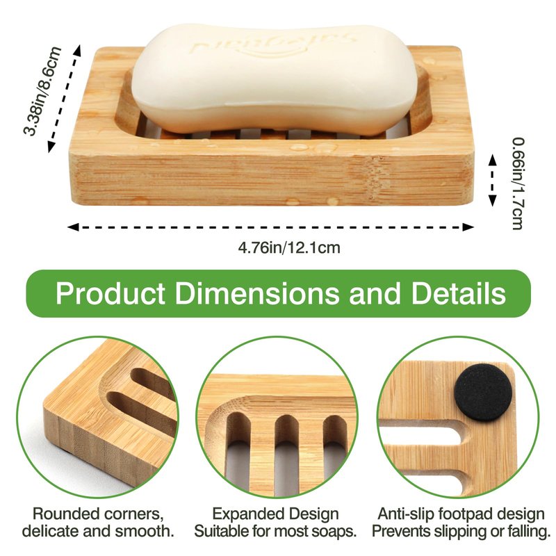 - With a sleek, minimalist design, these bamboo soap dishes add a touch of elegance to any bathroom or kitchen decor. The smooth, polished surface enhances the aesthetic, and the four black anti-slip pads on the bottom prevent any slipping or sliding.