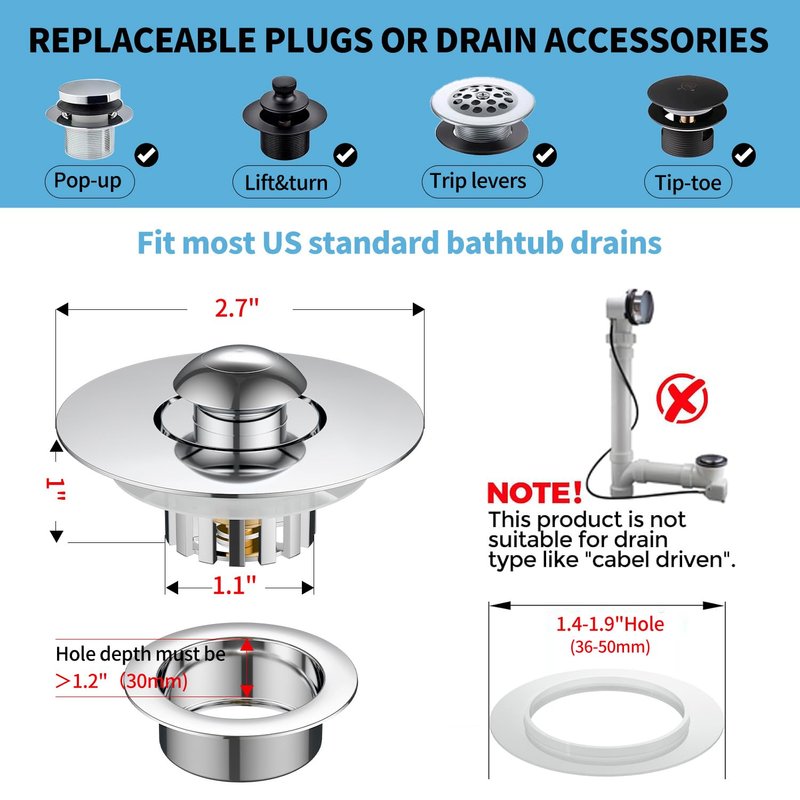 - 【Premium Solid Brass Construction】Crafted from corrosion-resistant solid brass with a polished chrome finish, this tub drain stopper withstands daily use and harsh bathroom environments. Unlike plastic alternatives, it resists rust, bending, and wear for years of reliable performance.