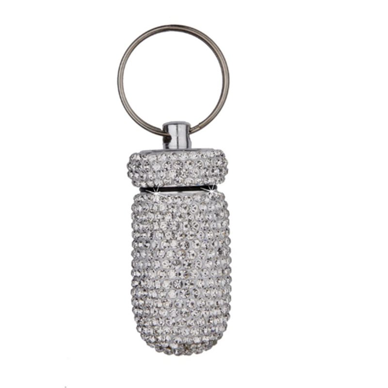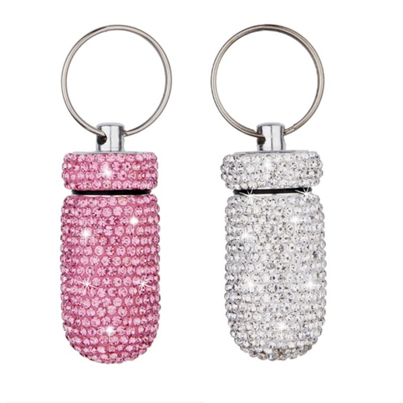 2 Pack Bling Crystal Rhinestones Waterproof Pocket Keychain Pill Holder,Portable Mini Aluminium Alloy Pill Organizer Case Container to Hold Vitamins for Outdoor Camping Travel(Silver,Pink)