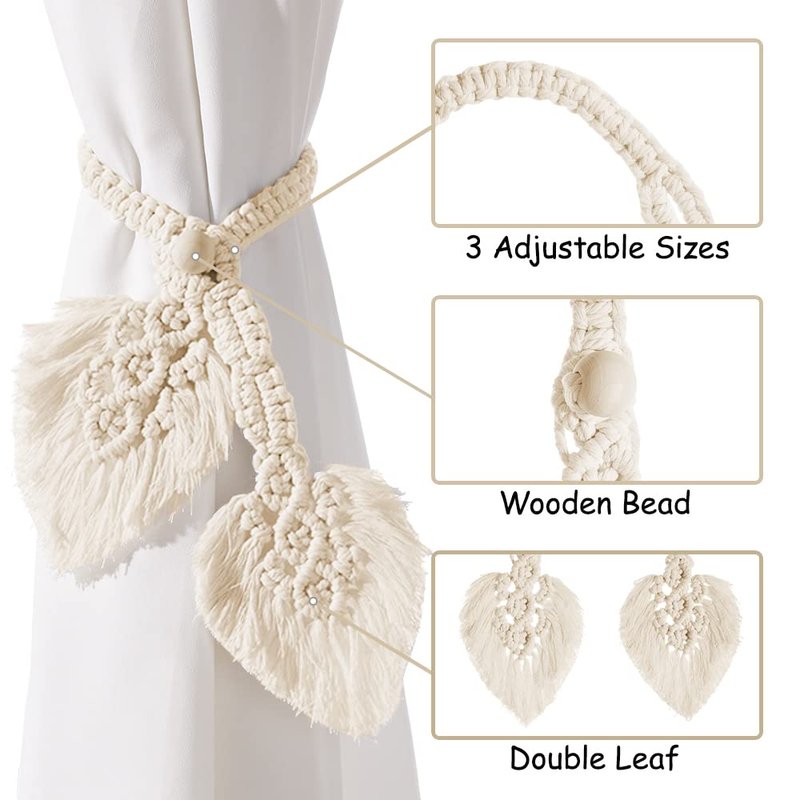 2 Pack Boho Curtain Tiebacks,Hand Knitting Cotton Curtain Holdbacks with Adjustable Natural Wooden Bead,Double Leaves Farmhouse Theme Curtain Tie Backs, for Indoor Outdoor Drapes Decorative,(Beige)