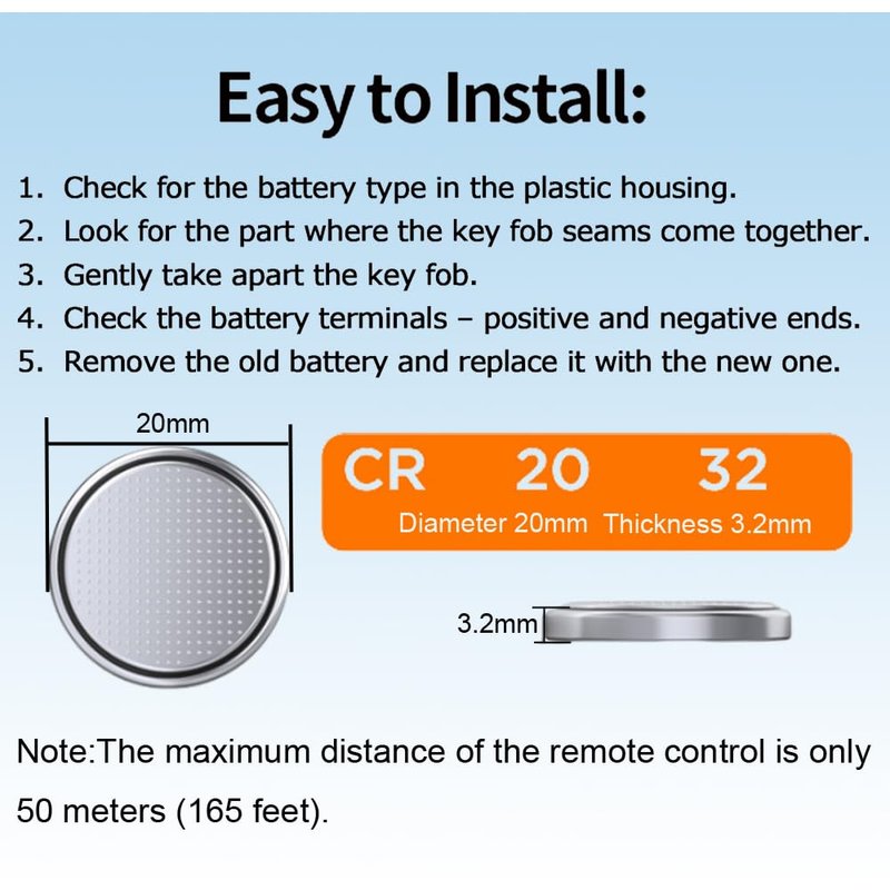 EASY TO INSTALL-No need to schedule battery replacement service, no need to reprogram remote control.Battery replacement is recommended before or after seeing the "Key Battery Needs Replacing" or “Low Key Fob Battery” message on the car dashboard (if applicable) or if your remote range is reduced and/or works intermittently