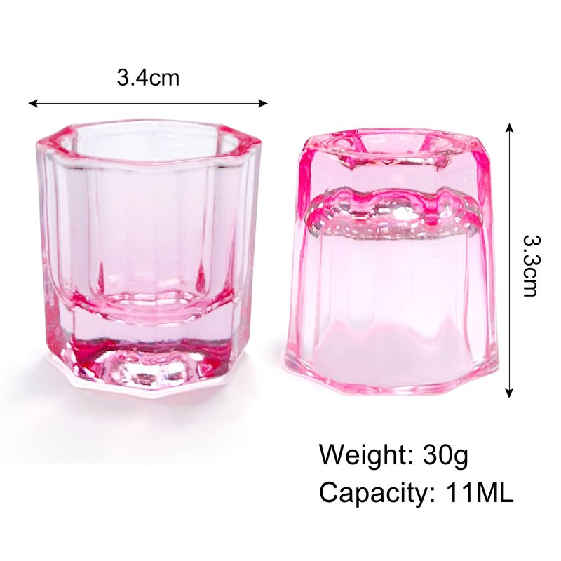 - Net Weight: 30g / 1.05 oz per piece; Capacity: 11 ml - Perfect to Dip Your Brush in, Without Exposing the Handle to Acetone inside. And will not Waste a Lot of Product. They are Glass and very Easy to Use when Using it for Liquids, Such as Nail Polish Remover or the Acrylic Liquid. And Easy to Wipe Clean.