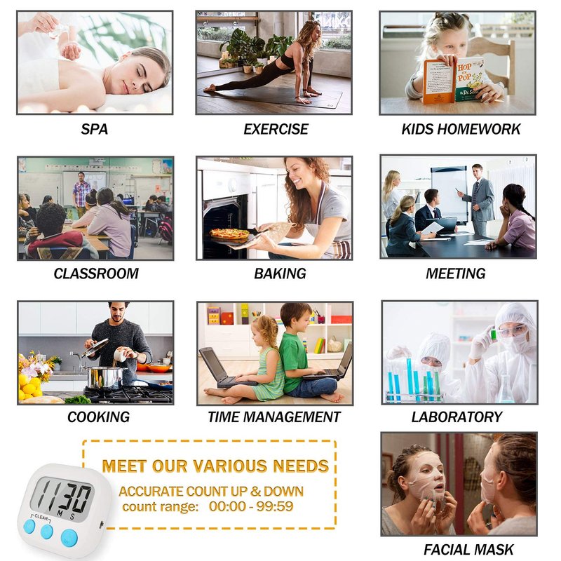 2 Pack Digital Kitchen Timer —— 180 Days Warranty AOUCE Timers with Big Digits, Loud Alarm, perfect for Cooking Baking Sports Games Office Upgraded Rubber magnetic 2.0 backing Package: 2 pack timers white Required Single AAA Battery (Not Included) COUNTS UP AND DOWN - As well as a countdown timer and minute timer this can also act as a stopwatch counting up from zero. Maximum time is 99 minutes, 59 seconds. Diverse and Decorative: Timer has kick-out stand for placement on the table-top. Magnetic back for placement on the refrigerator and hook for hanging Applicable people and Benefits: Perfect timer for women or mens gym workout, cooking ( egg timer ), baking, beauty, and use for take medicines on time. It is amazing choice! Quality Service: Each of our timers in carefully tested and rigorously packaged, order with confidence, click and add to cart now!