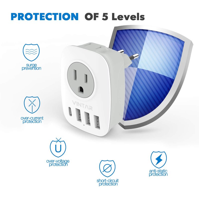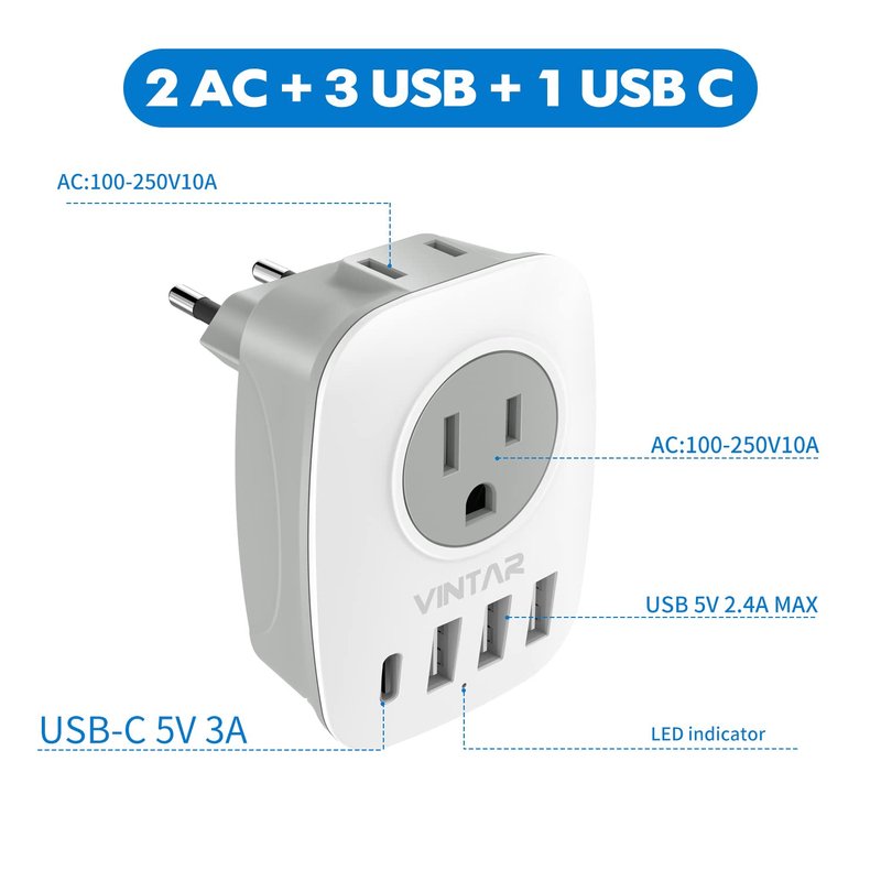 - 6-IN-1 EU POWER ADAPTER-- The European travel plug adapter turns one European Type C socket into 2 standard American outlets & 3 USB and 1 USB C charging ports, Max Capacity Up to 2500 Watt (max 250 Volt, 10 A); 3 USB Ports can charge up to 2.4A, USB C charge up to 3A, owing you charge 6 devices simultaneously. ideal for Cell Phone, Laptops, Camera, Power Bank ect;
