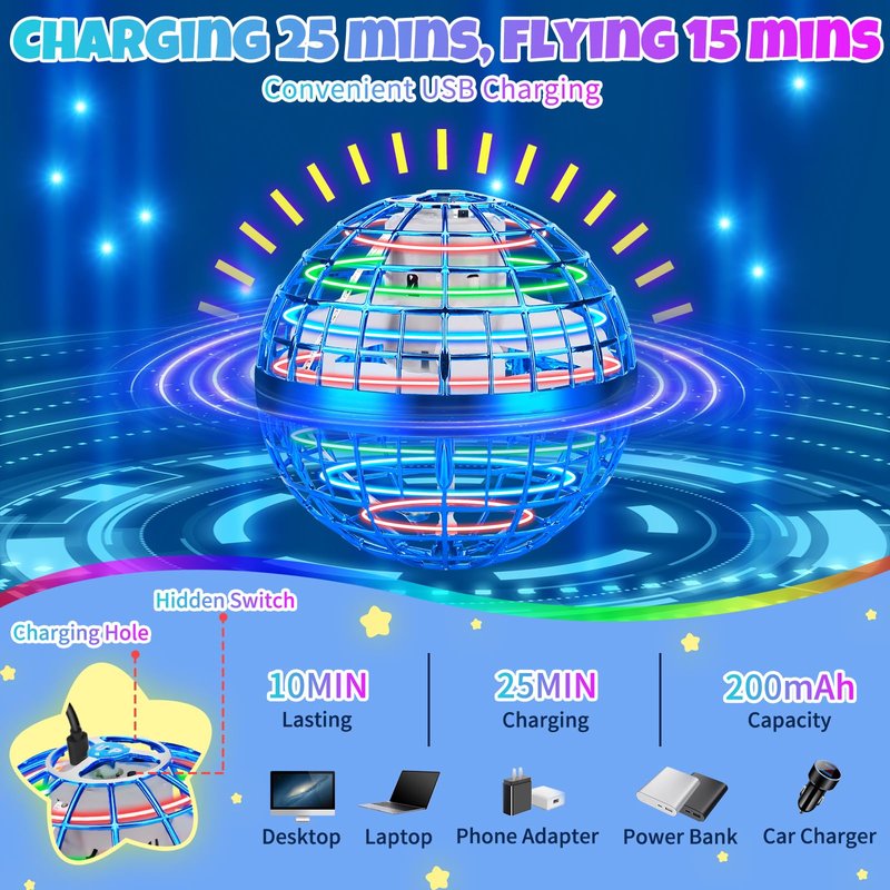 - 🔌【USB Rechargeable & Portable Design】This orb ball flying is not only entertaining but also eco-friendly with its USB rechargeable feature. Simply connect it to any USB device like a mobile power bank or laptop, and within a quick 25-minute charge, you'll have a full 6-8 minutes of thrilling flight time. Its compact and portable design ensures that you can take it with you wherever you go without it taking up much space. Whether you're at the park or on a trip, it is always ready for action.