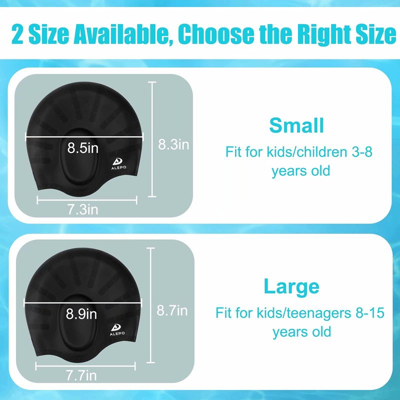 - [3D ERGONOMIC EAR POCKETS]: Alepo child swim cap is designed with 3D ergonomic ear structure, which makes the swim cap has extra room for ear covering, so it can effectively prevent overpressure and add an extra layer of protection for ears by limiting the water flow entering your ears, protecting ears from chlorine,sand, other substance in the water!