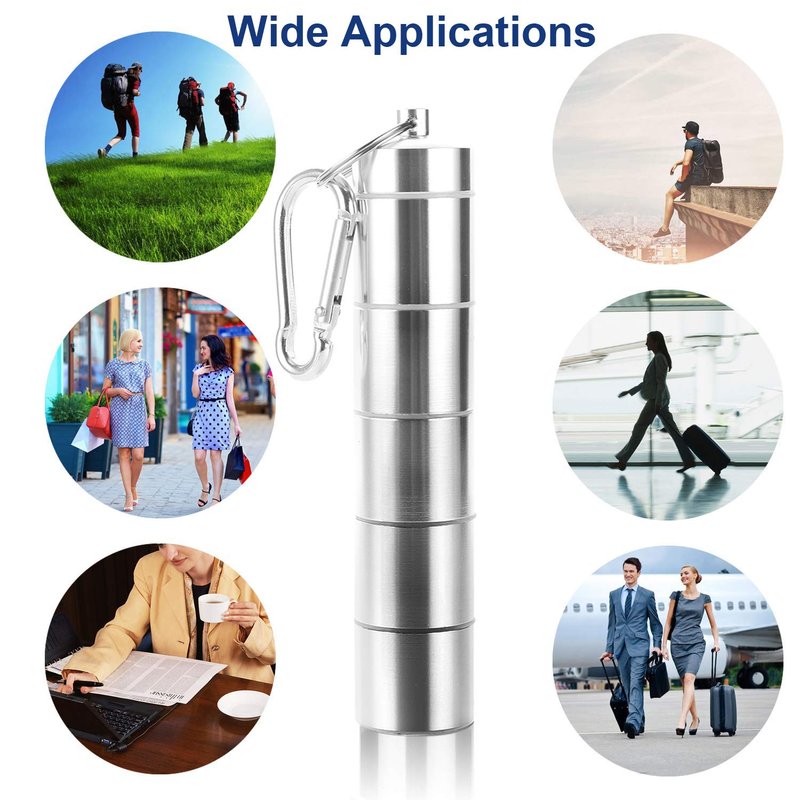 - 【Wide Applications】Perfect for outdoor travel, camping, hunting, hiking, fishing, cycling, golfing, adventure, first aid, outdoor life-saving and other outdoor activities or home use. Package include 2 piece portable pill organizer/ metal pill container/ daily pill dispenser with a keychain and a carabiner