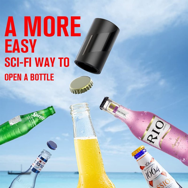 - Sleek Design & Portable : Our beer openers features the smooth surface with good hand feeling, It may look like a magical decapitator bottle opener from the future, but it's actually a super simple spring loaded bottle opener that makes every bottle opening experience way more fun. Small Footprint Saves Space - Our bottle opener is small enough to store discreetly away when not in use. Keep the automatic beer opener next to your fridge, storage rack, credenza, etc.