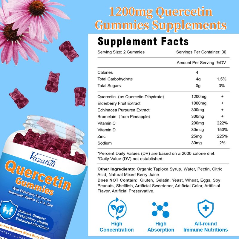 - 8 in1 Quercetin Complex, Get Multiple Benefits: Per serving 2 gummies are formulated with 1200 mg quercetin, 1000 mg elderberry extract, 300 mg echinacea extract, 300 mg bromelain, 200 mg vitamin C, 30 mcg vitamin D, 25 mg zinc and 30 mg sodium, which promote a well-balanced immune system, support gut health, strengthen antioxidant, build strong muscles and joints, and nourish skin and anti-aging