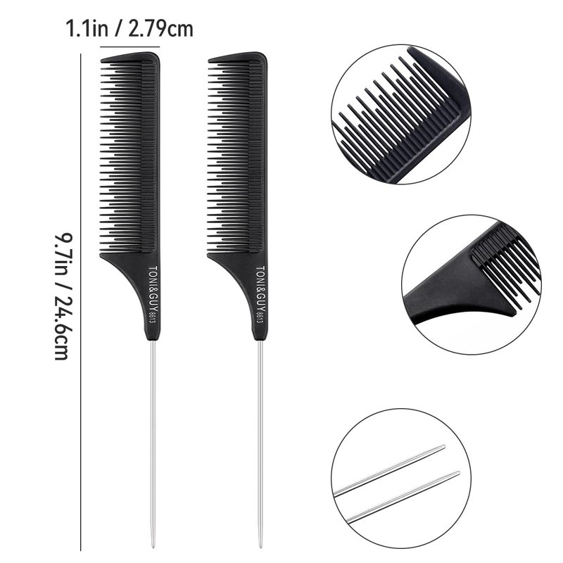 2 Pack Rat Tail Comb Black Teasing Comb for Sectioning, Parting, Styling Hair (Stainless Steel Pintail)