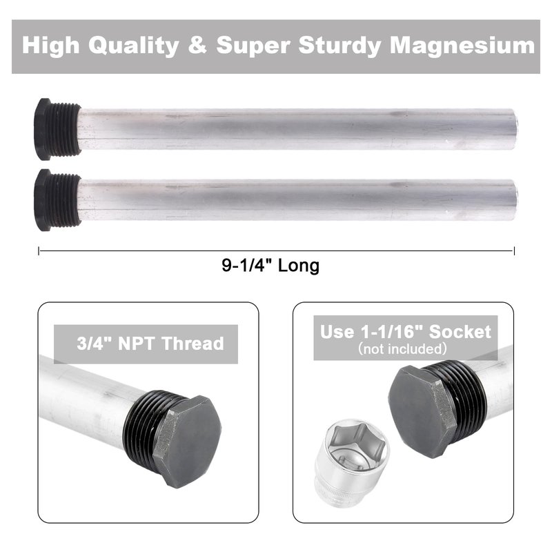 - Size and Material Type: Magnesium anode rod, 9.25" long,¾" threads, Uses a 1-1/16’’ socket.