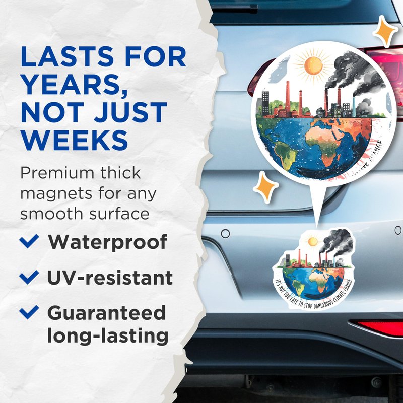 Our Save The Planet Magnets are a powerful statement for environmental awareness. Designed with a vibrant graphic illustrating the impact of climate change, they remind us of the importance of taking action. The eye-catching design includes factories emitting smoke, set against a backdrop of a beleaguered Earth, urging observers that "It's not too late to stop dangerous climate change." Perfect for refrigerators, whiteboards, and any metal surfaces, these magnets are both decorative and educational, encouraging conversations about sustainability and ecological responsibility. Bring a touch of environmental consciousness to your home, office, or classroom. Every glance at these magnets serves as a powerful reminder of our role in protecting the planet. Easy to attach and remove, our magnets support ongoing efforts to raise climate change awareness. Inspire others to join the cause of environmental protection with these unique and impactful magnets. A valuable addition for eco-conscious individuals.