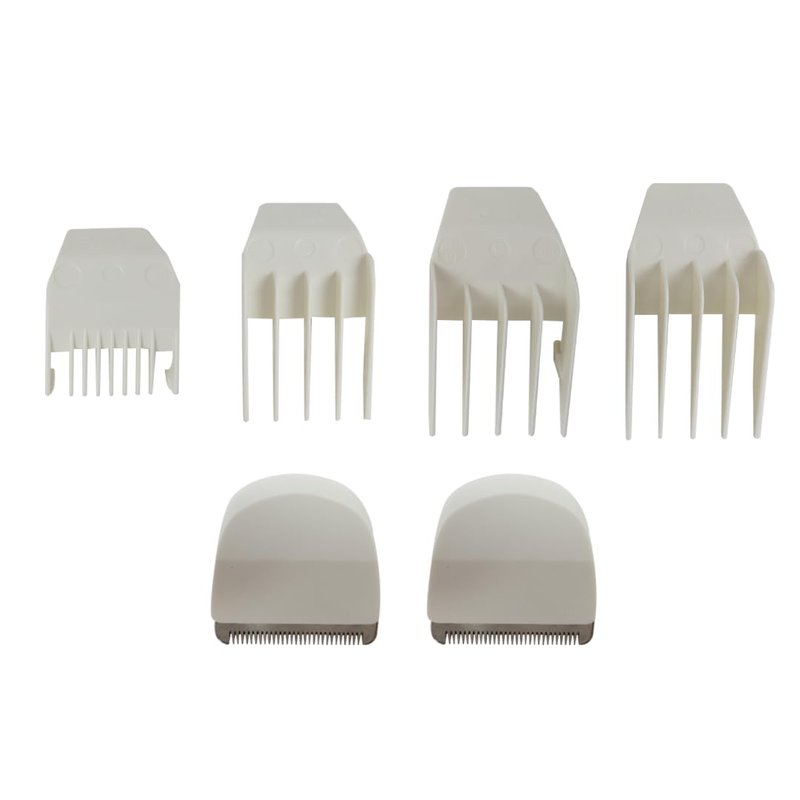 Package Includes: 2-pack white clipper trimmer blades, 4-pack attachment comb cutting guides