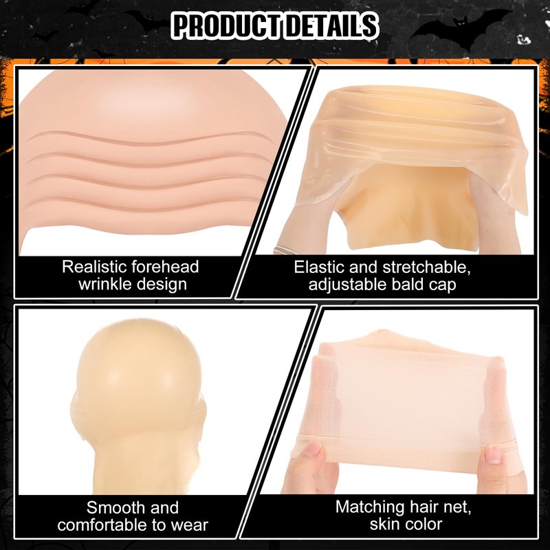Bald caps makeup latex bald head wig cap bald hat costume accessories for adults and kids Wonderful costume accessory: The bald caps are great for children and adults to dress up as a bald guy. Whether it is for Halloween or a costume party, this cap will make your costume more realistic and draw a lot of attention. Reliable material: Made of quality latex, the caps are stretchy and wear-resistant, soft and comfortable to wear, will not scratch your skin, durable for long-time use. Multi-purpose wig cap: Not only can be applied directly as a bald cap, you can also add hair on it for more role-playing possibilities. Suitable for most head types for men, women and kids, great cosplay accessory for boys and girls who love playing dress up. Specifications: Material: latex Color: as the picture shown Package includes: 2 x Bald caps for adults costume 2 x Mesh wig caps Warm tips: You can apply liquid latex to the edge of the cap and paste it on the skin, then use cosmetics to make it the same color as the skin for better results, Fix the existing hair with a wig before use.