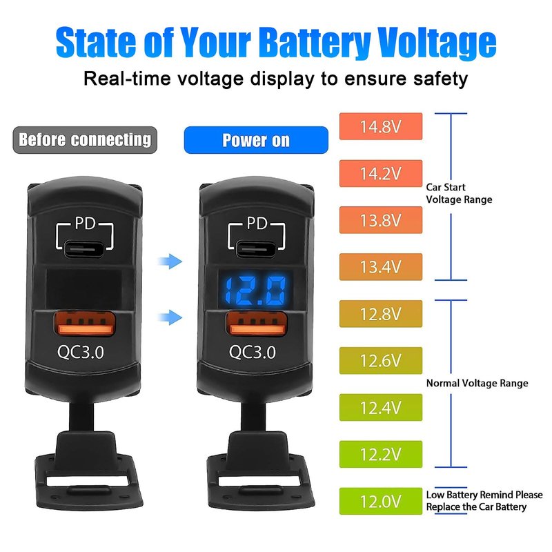 - LED VOLTAGE DISPLAY: This 2 Pcs 12V USB outlet feature a built-in voltmeter with LED voltage display, which allows you to easily manage your vehicle's voltage health and performance.