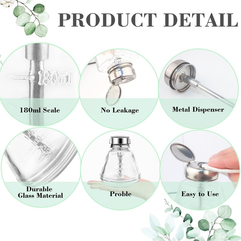 - 【Push Down Dispenser Bottle】The key feature of this glass push down dispenser bottle lies in its effortless dispensing mechanism. With a gentle press of the dispenser, the liquid swiftly ascends from the bottom to the surface of the bottle. There's no need for strenuous squeezing or tilting the bottle. This design provides utmost convenience, allowing you to effortlessly control the amount of liquid during your makeup or nail care routines, saving you time and effort.