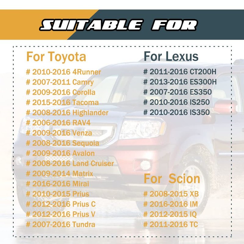 - [Extensive compatibility]: 2010-2016 4Runner, 2007-2011 Camry, 2009-2016 Corolla, 2015-2016 Tacoma, 2006-2016 RAV4; 2011-2016 TC,2008-2015 XB; 2013-2016 Lexus ES300h, etc;