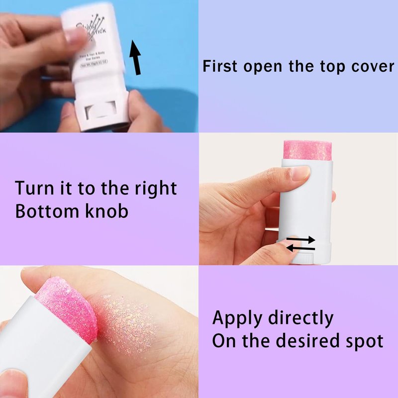 - 4 Colors Glitter Stick: You can't finish your glitter makeup with one color, so we've prepared four color outfits, including silver, blue, gold and pink, to mix and match to create personalized highlights and brighten up your party night.