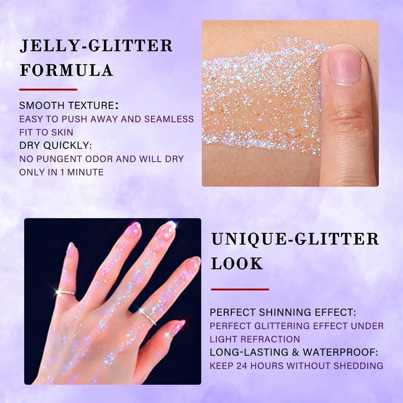 - Delicate Texture, Easy To Sse: Glitter paint color is high, there is a lot of glitter, also easy to apply, just need to twist the applicator to light, glitter stays overnight, will not stain or fall off. For better results, you can add more layers after drying. The glitter gel is easy to remove and can be easily removed with some soap and water.