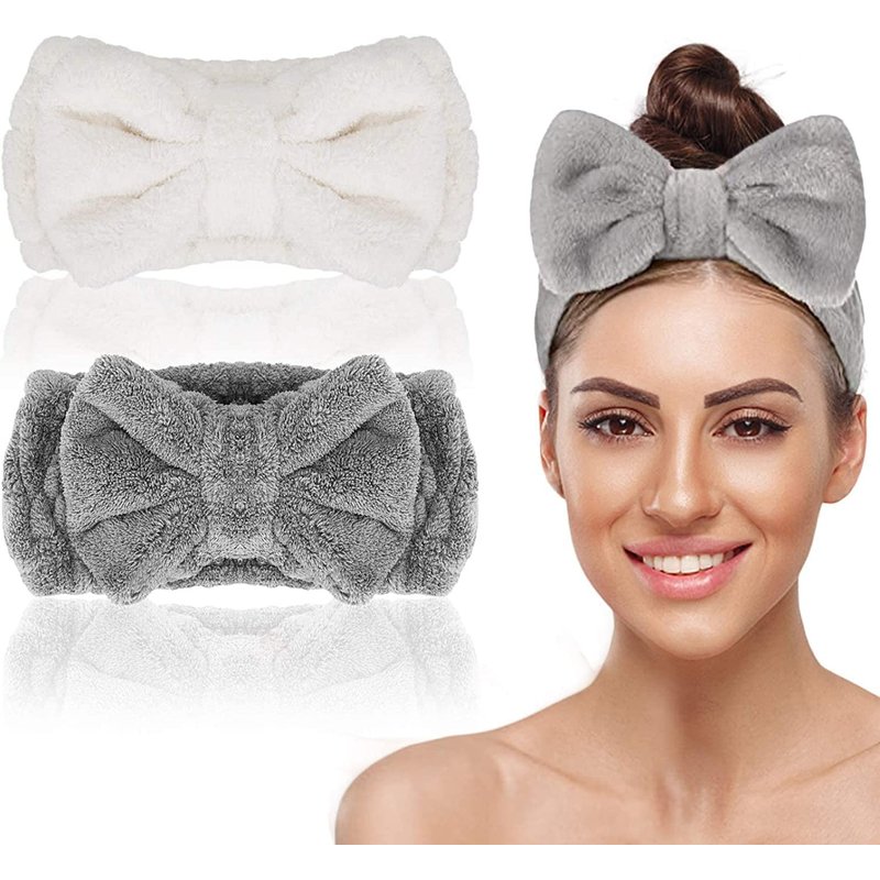 2 Pcs Bowknot Spa Headband, Soft Coral Fleece Facial Makeup Hair Wrap Makeup Fluffy Headband for Women Girls Washing Face Skincare(White/Grey)