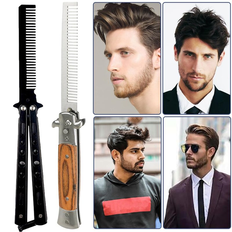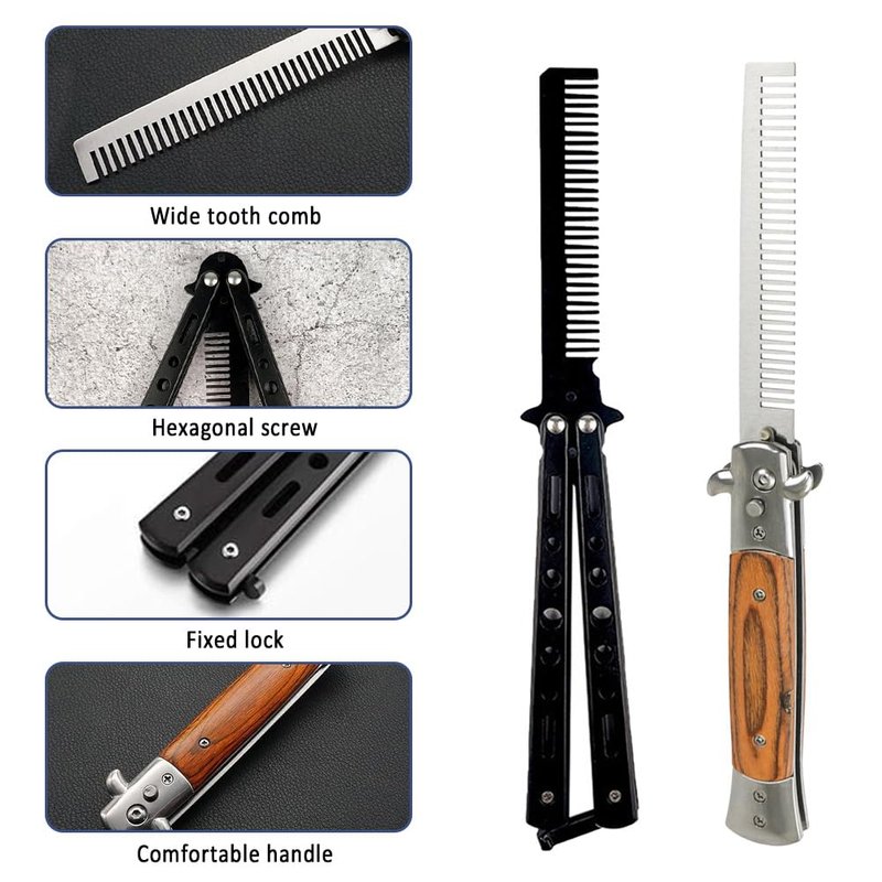 2 PCS Butterfly Comb Stainless Steel and Wood Grain folding beard combs Foldable Pocket Comb For Beard, Mustache,Scalp Hair,Salon Beauty Tool