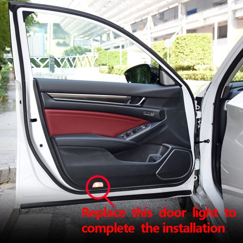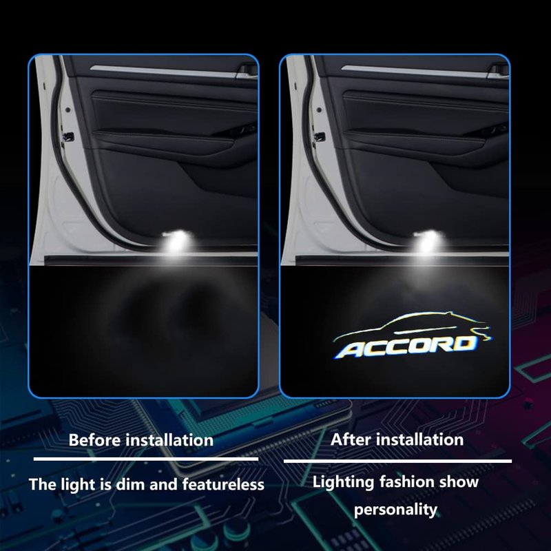 Fit for Accord 9 2015-present Features 100% brand new Voltage: 12V Output power: 5W Material: ABS + Aluminum alloy Quantity: 2* Compatible Welcome Lights Working Temperature:-40℃-105℃ Features: Installed Simply, Good Looking and Utility High Brightness LED, Lower Power Consumption Note: Please confirm your car model and the year before purchasing. How to replace car door light(Installation Instructions): 1. Use a flathead screwdriver to remove and disconnect original doorstep lights. 2. Plugin new door lights with a correspondent connector. 3. Put new door lights to the spot where your original lights were. 4. Installation successful. The logo should be projected on the ground.