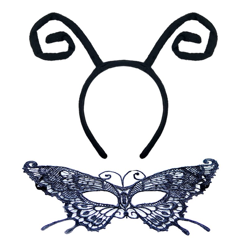 2 Pcs Halloween Butterfly Antenna Headband Lace Mask Black Hair Hoops Masquerade Masks Headpiece Hairband Hair Bands Women Christmas Party Decoration Cosplay Costume Cute Dress Up Hair Accessories