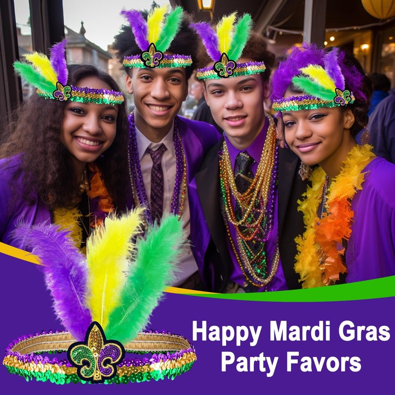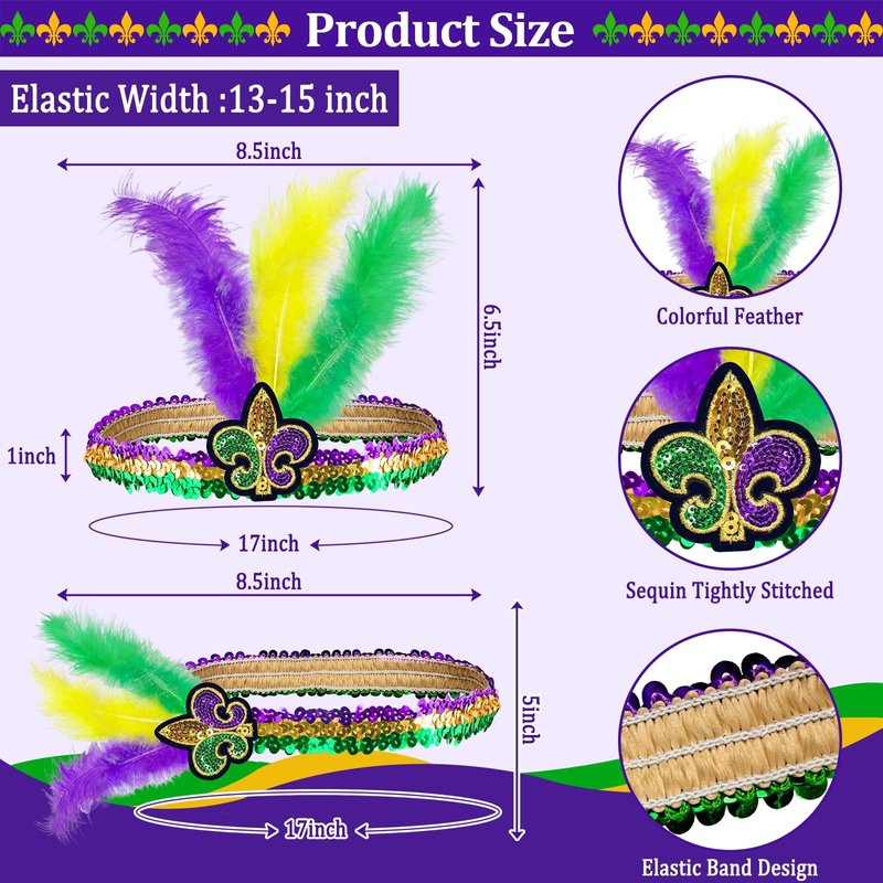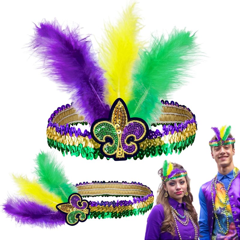 - 【Premium Material】This set of 2 Mardi Gras headbands is crafted from feathers, sequins, and elastic bands, offering a soft and comfortable texture. Wearing it to a Mardi Gras party will surely make you stand out.