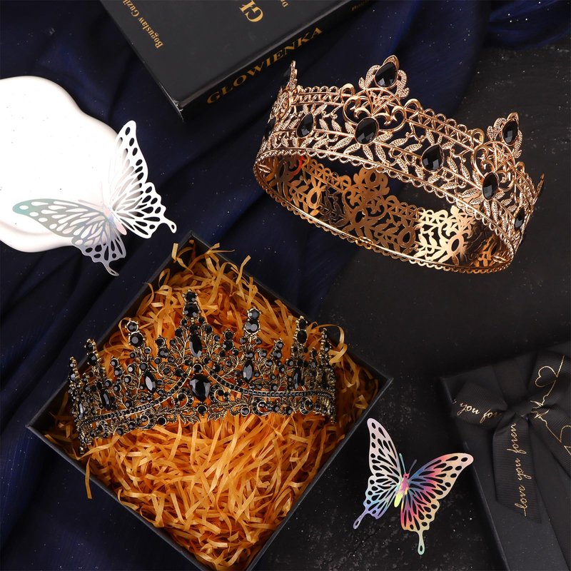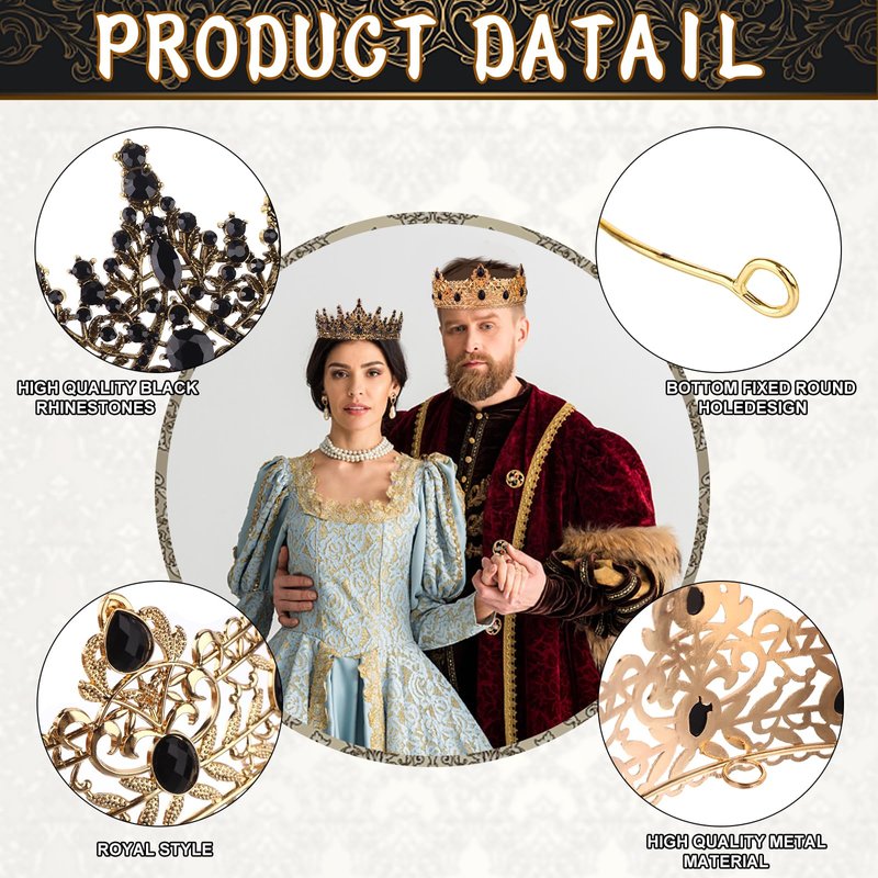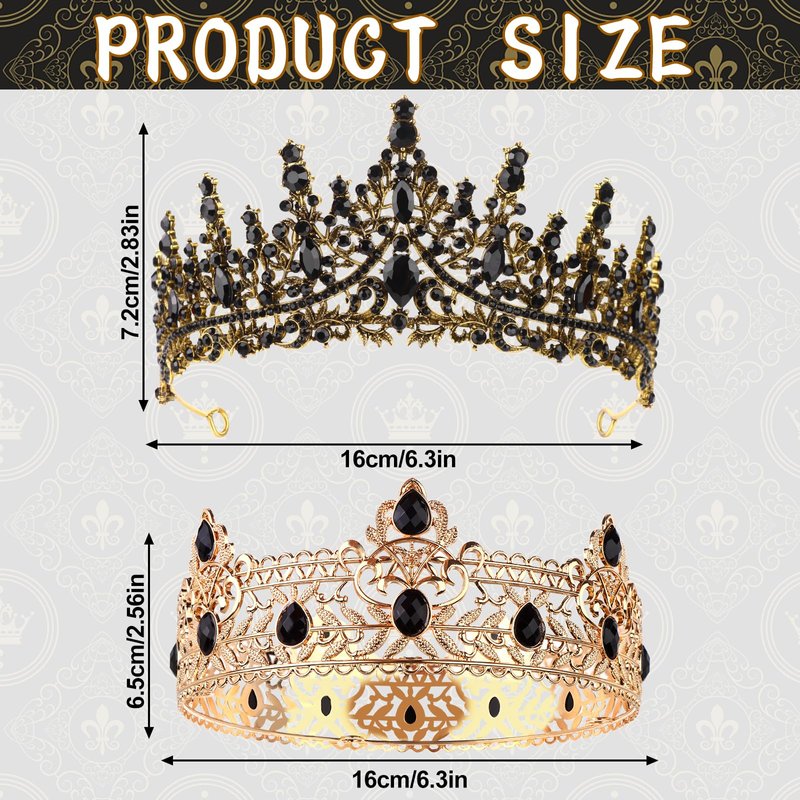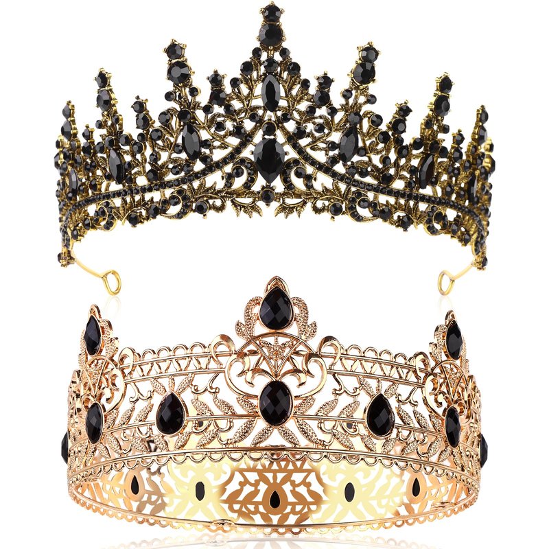 - King and Queen Crowns: there is a baroque king crown for men and a blask tiara for women, with black crystals on the crown surface,this crown design based on vintage style, greatly to show its culture and fashion