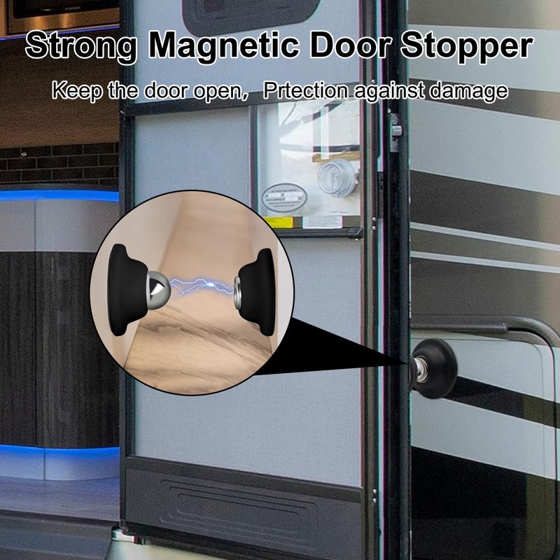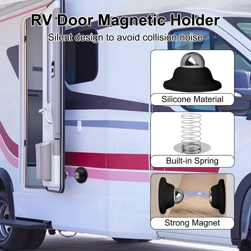 - 【Strong Magnetic RV Door Holder】The rv magnetic door catch has a strong magnetic silent design, the magnetic door stopper absorbs the force of closing too hard preventing your door from slamming shut, the internal spring buffer ensures that your door closes gently to protect your caravan from damage and also reduces the noise of the door closing to create a quieter environment for you.