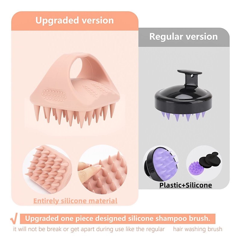 - The one piece designed shampoo brush is made of food-grade silicone, so the scalp scrubber will not break or tear during use.