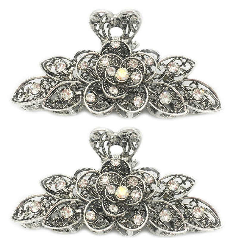 2 Pcs Women Retro Chic Rhinestone Alloy Fancy Hair Claw Jaw Clips Pins -Vintage Flowers Hair Catch Updo Grip Hair Accessories for Thick Hair