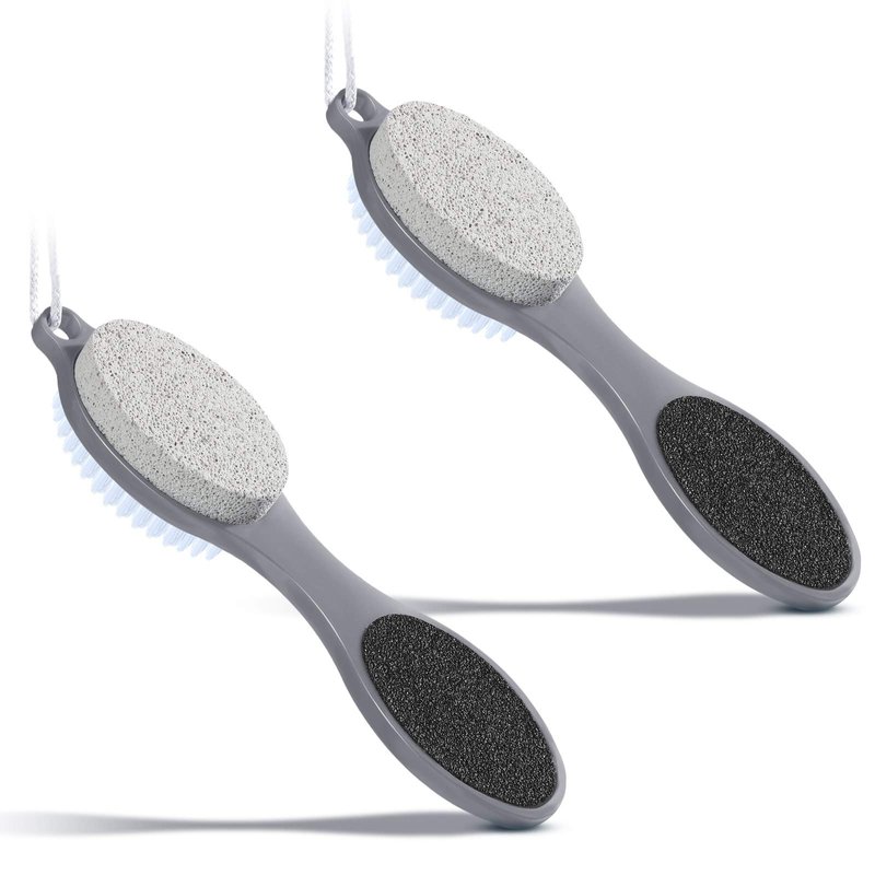 2 Pieces 4 in 1 Pedicure Tool Foot Scrubber Brush Foot File Callus Remover with Foot Rasp, Pumice Stone, Nail Cleaning Brush and Sand Paper for Dry and Wet Foot Care Dead Skin Remover (Gray)
