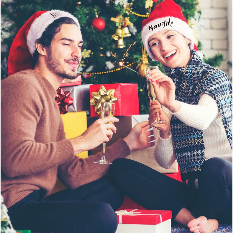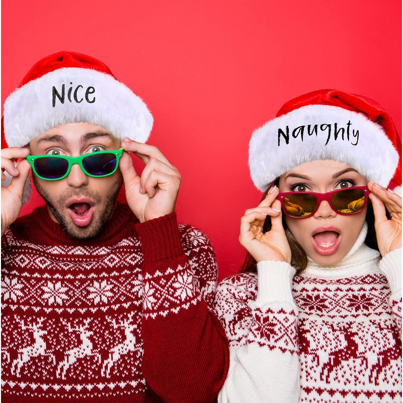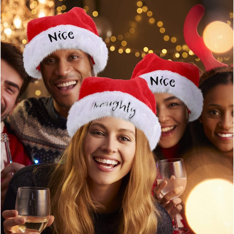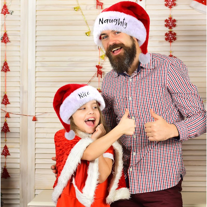2 Pieces Naughty and Nice Plush Christmas Santa Hats Buffalo Plaid Holiday Hat for Christmas Party Supplies (Red, Black, Adult Size)