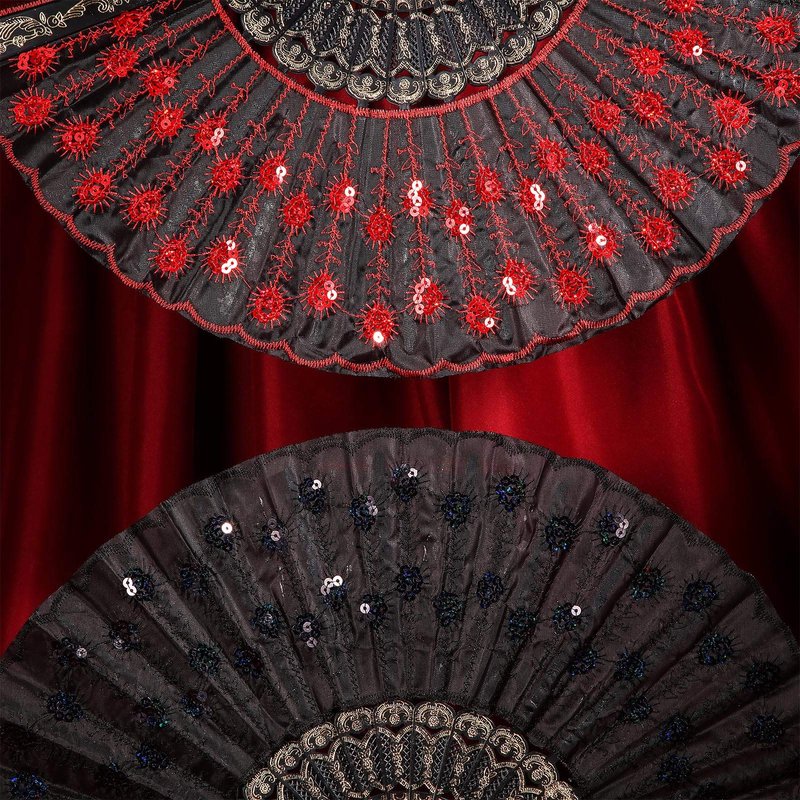 2 Pieces of Sequin Fabric Folding Fans Embroidered Flower Lace Trim Peacock Fan Fabric Plastic Folding Handheld Fan for Women Hand Craft (Red, Black)