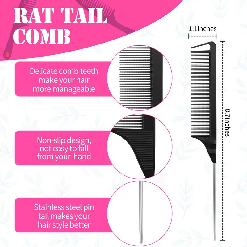 - Delicate design: rat tail comb is designed for hair parting and daily using, with long stainless steel pin tail; The handle is comfortable and stable to hold because of nonskid surface, with wide teeth for management of long, thick or curly hair and fine teeth for short and thin hair; The hand-held alligator clips have spring force and can automatically adjust to fix any kind of hair